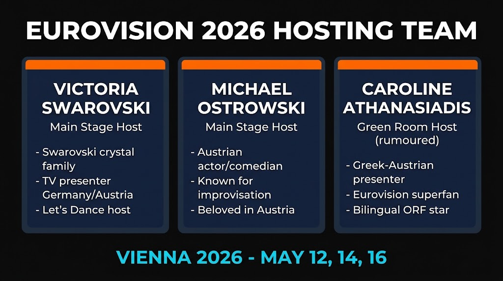 Eurovision 2026 in Vienna has assembled one of the most intriguing hosting teams in contest history. Victoria Swarovski brings international glamour, Michael Ostrowski delivers beloved Austrian comedy, and Caroline Athanasiadis โ the rumoured Green Room host โ adds Greek-Austrian warmth and deep Eurovision fandom. Here are the full profiles and what each brings to the contest.