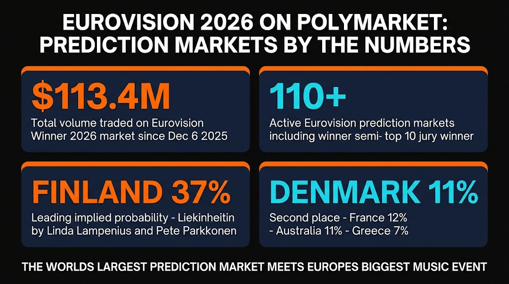 The numbers are staggering: $113.4 million in total volume traded on the "Eurovision Winner 2026" market alone since it launched on December 6, 2025. Across all Eurovision-related markets on the platform, the figure is even higher. More than 110 active markets cover everything from the outright winner to top 3 finishes, jury vote winners, semi-final qualifiers, and individual country matchups.