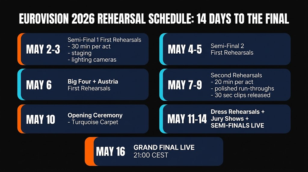 First artist rehearsals begin on Saturday May 2, 2026 at the Wiener Stadthalle in Vienna. Semi-Final 1 songs 1โ7 rehearse first, starting at 10:30 CEST. The full rehearsal period runs through to May 16 (Grand Final day).