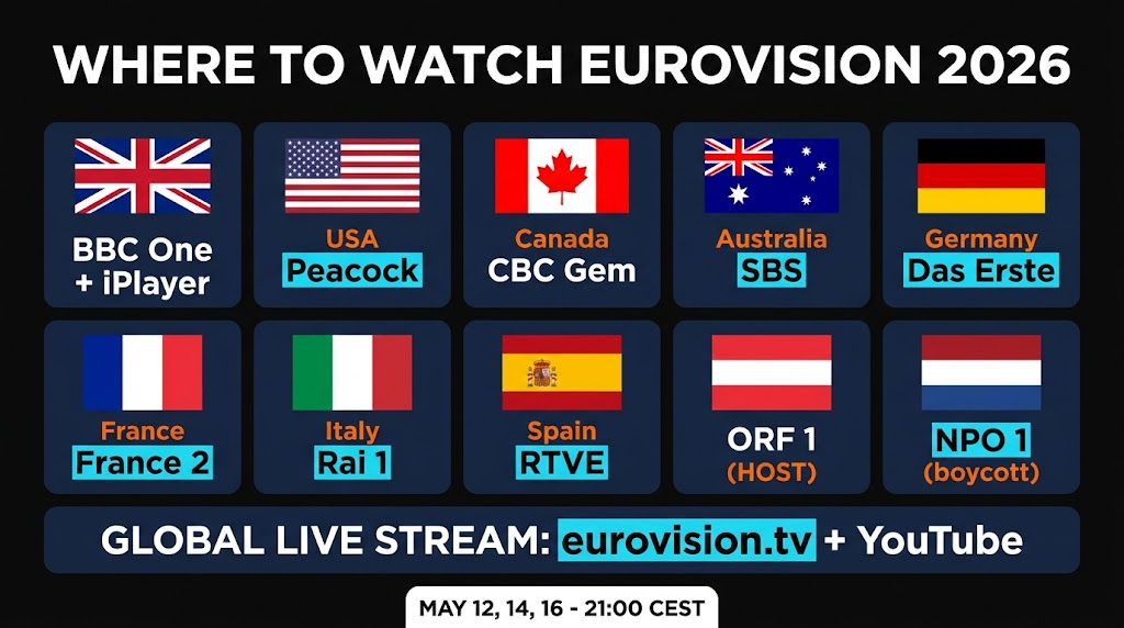 Eurovision 2026 broadcasts on May 12, 14, and 16 from the Wiener Stadthalle in Vienna. With 150+ million viewers expected, finding the right channel or stream for your country is crucial โ and the good news is that almost every country has free, legal options. Here is the complete country-by-country guide to watching Eurovision 2026 live.