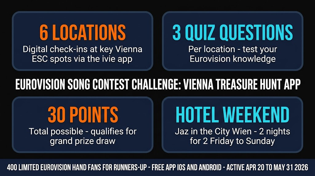 Launched on April 20, 2026 and running through May 31, 2026, the Challenge is a citywide treasure hunt accessible entirely through the free ivie official Vienna app. Check in at 6 Eurovision locations, answer quiz questions, and qualify for a weekend-in-Vienna grand prize. Here's exactly how it works.