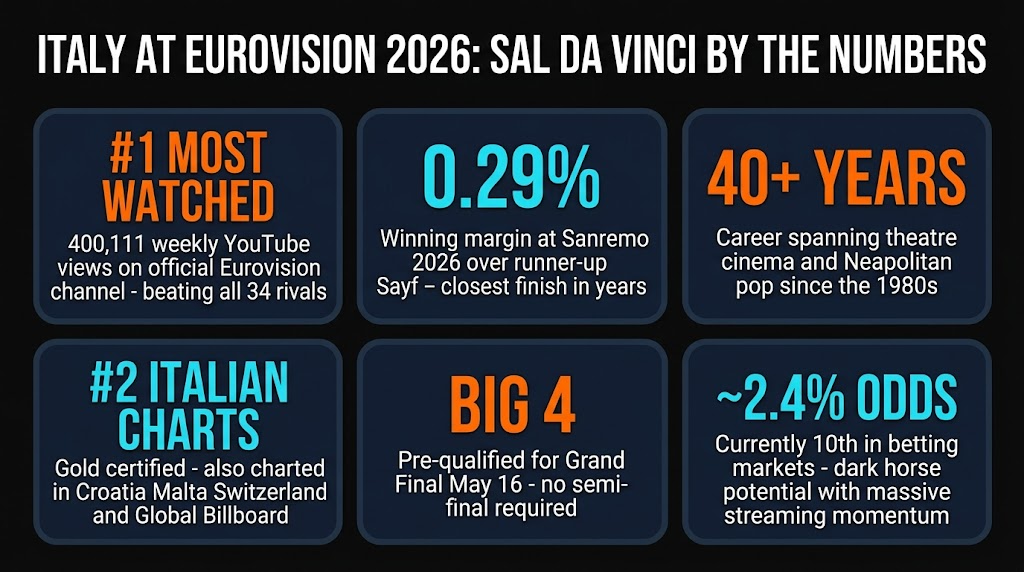 Sal Da Vinci is not the kind of Eurovision entry that generates viral TikTok moments or headline-grabbing controversy. He is something rarer: a world-class performer with an authentic story, a beautifully crafted song, and a four-decade career's worth of stage experience. "Per sempre si" is the #1 most-watched Eurovision 2026 song on YouTube, the #1 most-streamed on Spotify, and it sits at just 10th in the betting.